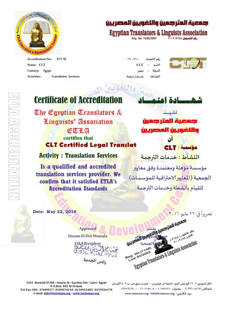 نحن معتمدون من جميع السفارات والجهات الحكومية والمحاكم، ونقدم الترجمة بنفس شكل وتنسيق المستند الاصلي وبالالوان، ونقوم (بتدبيس) الترجمة مع صوره من المستند الاصلي بدبوس معروف في السفارات والمحاكم، ثم نقوم بالختم علي الدبوس وعلي كل ورقه من الترجمه و صور الاصل بالختم المعتمد المسجل عليه رقم البطاقه الضريبيه والسجل التجاري وتاريخ الترجمه وتوقيع المترجم. ويمكننا ارفاق صوره من شهاده الاعتماد الخاصه بنا مع الترجمة لتقديمها الي السفارات والجهات الحكومية